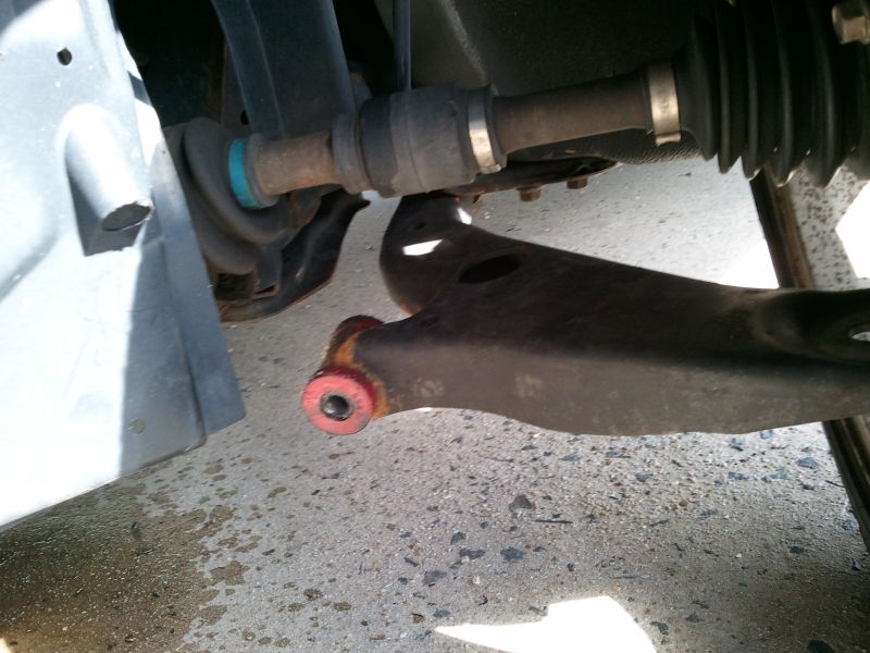 here's whats been done: lower control arm torn bushings replaced with pedders polyurethane bushings. dented wheel replaced, remounted old tire. 4 wheel alignment.