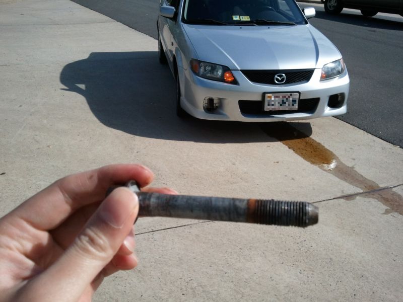 my dad found this bolt a few meters behind the car. you can see the tire tracks on the street from when this occured and i managed to direct it towards the closest intersection and as far off the road as possible. thats transmission fluid leaking, the half shaft was pulled out at the same time. brought it back to the shop and they apologized, reinstalled the bolt, control arm, reinstalled the half shaft, refilled the trans fluid, and said that luckily nothing else was affected.