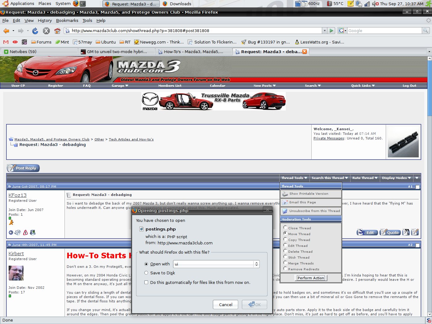 Different browsers, different operating systems, different computers, all the same symptom. Firefox won't just display PHP code, so it spits it out as a file download. This happens when I click basically anything on the site, including sometimes submitting a new post or thread. --but obviously it doesn't happen all the time.